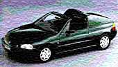 さてでは何が罰当たりなのかというと、写真をクリックしていただけるとわかると思いますが、某イギリス車風に仕上げてみようと言うわけなのです。頭で思いついた段階ではもっと似ていたのですが、残念ながら実際やってみるとやはりCR-XはCR-Xです。筆者が似てると思ったポイントは、まずフロントのライト配置、そしてB&Cピラーの造形なんですが、実際のヨーロッパの写真を見てみると(あっ書いちゃった)もっとCピラーが引っ張られて荷台みたいになってるんですよね、あと似ない最大のポイントは、やはり車高でしょう。ヨーロッパのあの薄さは、初めて見たときは衝撃的でした。デザイン的にも、ヨーロッパは本当にスリッパみたいに床にへばりついているのですが、CR-Xはスリッパと地面の間にかなり隙間があるんですよねぇ(うーむ文章で説明しきれてませんね)。でも発想自体は面白いと思うので誰かやらないですかね、車高落として、ピンスト入れてボンネットにドーンとJPSのマークなんか入れたら結構見れると思うんてすけど・・・やっぱバカバカしいですか?