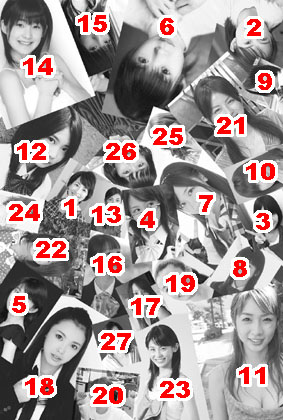 こうやって写真並べてみると物凄く傾向がはっきりしてくる感じ。1.白くてさっぱりしていて笑うと目が無くなるハニワ顔系。2.歳取っても可愛さが残る愛嬌有るタヌキ顔系。逆に無いのは、目鼻立ちがくっきりしてスキのない美人顔。そして平均年齢は29.8歳。なるほどねぇ。 | ||